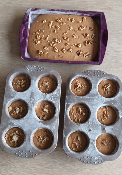 Spoon the batter evenly throughout the muffin tray (fill each approx. 3/4 full). Sprinkle extra chopped walnuts over the surface of the muffins and lightly press with a finger so the nuts stick once cooked.